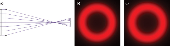 利用工具仿真,我们研究了超脉冲对各种类型的影响。对于每一个DOE,都准备了一个光学装置,包括一个高斯源(有一个波长或一个波长光谱)、DOE、消色差聚焦透镜和一个虚拟屏幕,以查看位于焦点平面上的结果。然后利用经典的射线追踪传播——一个远场物理光学传播工具,对光进行传播。为了演示目的,选择不同的输入光束直径来强调可能的结果。