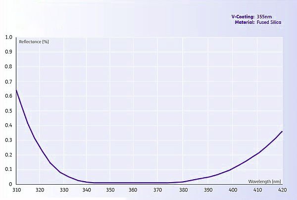其中,V型涂层是一种特殊类型的抗反射涂层,是一种高性能光学涂层。V型涂层只在很窄带宽内表现出很大的透射率,而其他波长的光束则显示出明显的高反射率。如下图,按波长绘制的反射率显示出V字形,这也是其名称的叫法。对于具有一种波长的激光器,V型涂层是首选,因为只有在特定波长处才会发生*小的反射。另外,由于设计的原因,其他波长的反射很强。因此,V型涂层仅当与特定波长较小时才使用V型涂层。