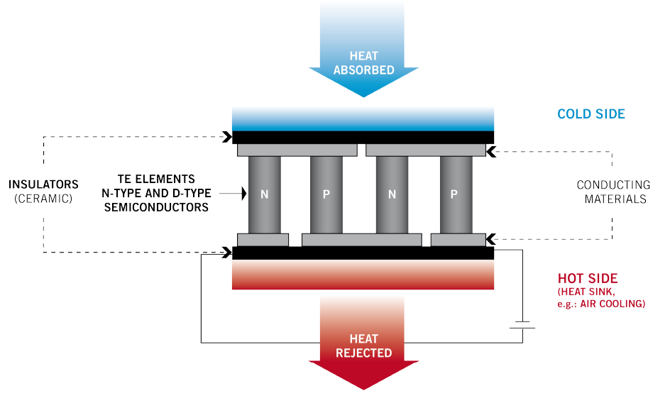 热电(TE)平台是由两个不同面组成的固态设备,放置具有不同电子密度、n型和p型的半导体,利用珀耳帖效应在两个面之间产生温差。冷面吸收热量,热量被带到散热器所在的另一侧。TE级通常并排连接并夹在两个绝缘体中。水冷或空气冷却通常用于散发此过程中积累的热量。