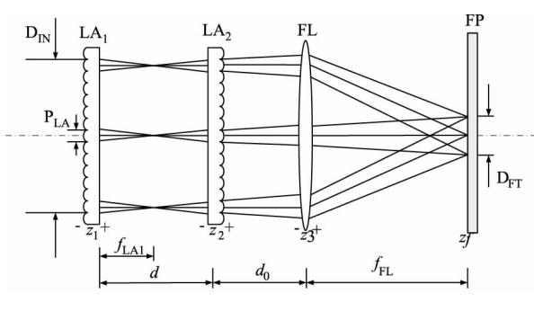 微透镜激光匀化光斑大小关系如下式所示:(pLA为透镜阵列的子单元口径大小)