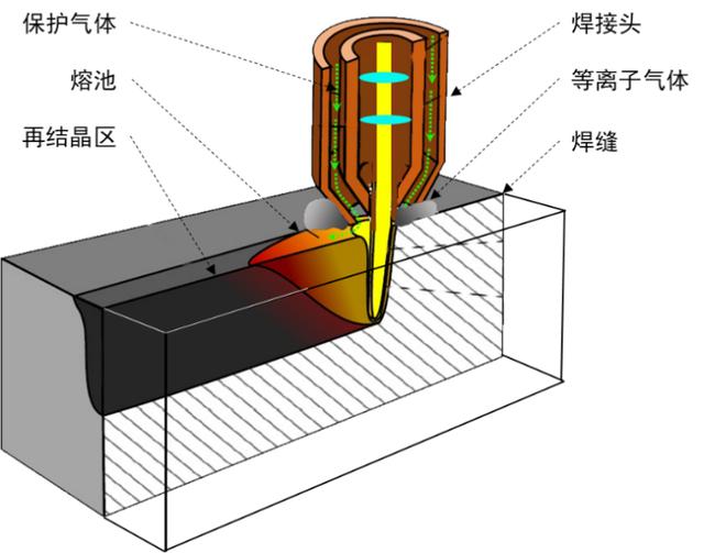 激光焊接作为一种现代焊接技术,是上个世纪*伟大的发明之一。自其发明之日起,被广泛应用于高端精密制造领域,尤其是新能源汽车及动力电池行业。尽管其具有配件昂贵,维修成本高等特点,但因其具有诸多优异与传统焊接工艺的有点,而得到了广泛推广。根据工作原理和加工场景的不同,激光焊接可分为复合焊接、激光钎焊、热传导焊、深熔焊和激光传导焊接五种。深熔焊示意图