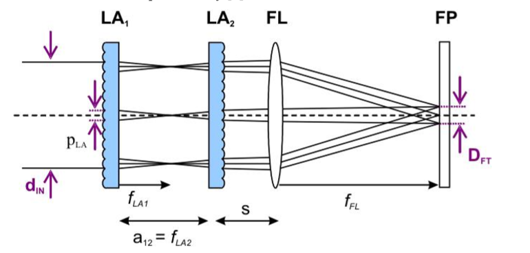 激光光源经过扩束准直后,平行入射。平行入射的激光束,打在第1面微透镜阵列上,经过每个子单元的聚焦,重新形成阵列排布的焦点。可近似地将入射的光束,看成对应于透镜阵列的光束簇阵列。重新聚焦后的多个小光束相互叠加,基于阵列排布的对称性,也即出射小光束的对称性,小光束的不均匀性相互抵消,*终在接收屏幕上形成均匀的目标光斑。原理图如下:(双微透镜阵列匀光光路)