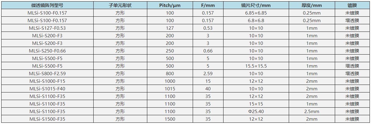 我司现隆重推出硅微透镜阵列,以满足可在红外波段的应用需求。现阶段的Si微透镜阵列虽然刚起步,但亦有数十个标准品型号。口径囊括常见的尺寸,在100-1500μm之间。因为硅制的红外微透镜阵列,材质折射率比较大,所以,相同的工艺下,我们不仅达成了与熔融石英微透镜阵列一致的加工精度,同时,在微透镜阵列的焦距上有了更大的可选择性。