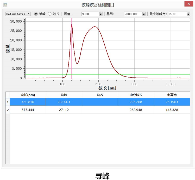 高级功能:光谱校准、自动扣除暗背景、外触发采集光谱、光谱积分、求平均值*大值和*小值、半透波长、峰谷检测、寻峰。
