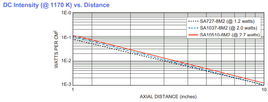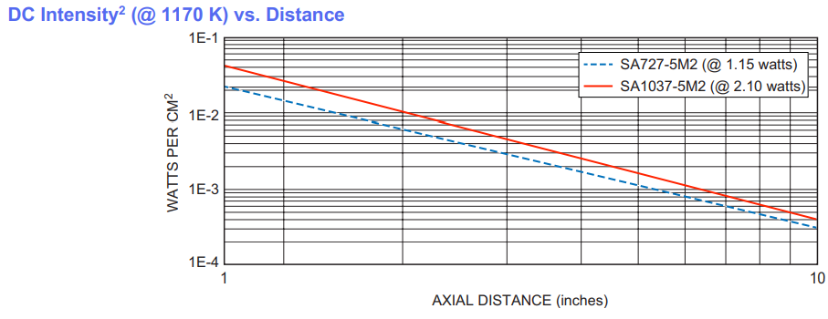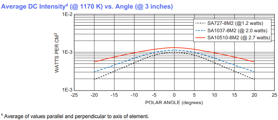 稳态发射器被设计用于灯丝温度约为1170K(900°C)的条件下工作额定输入功率。超过此值将提高元件温度并缩短发射器寿命。因为辐射能量与绝对温度(T4)的第四次方成正比,精确控制输入功率和封装的适当散热对于保持恒定的元件温度和输出是很重要的,散热器必须将封装温度限制在不超过 100°C。峰值波长与黑体辐射温度之间的关系由维恩定律表示为: