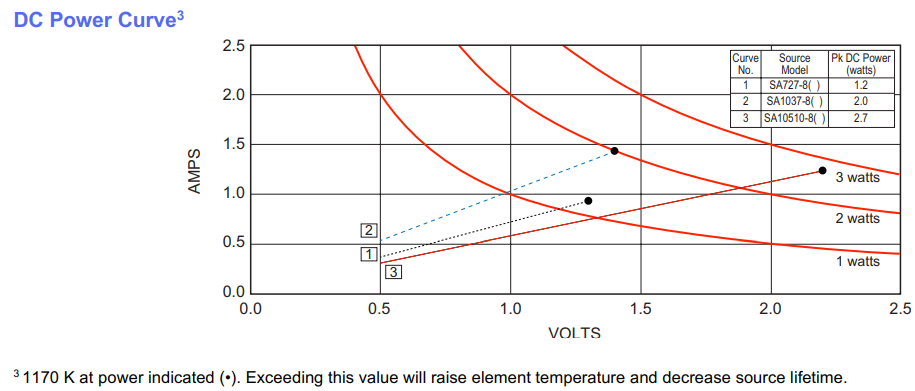 伏安特性曲线如图,额定功率时的温度为1170K,超过这个值会导致元件温度升高,使用寿命降低。