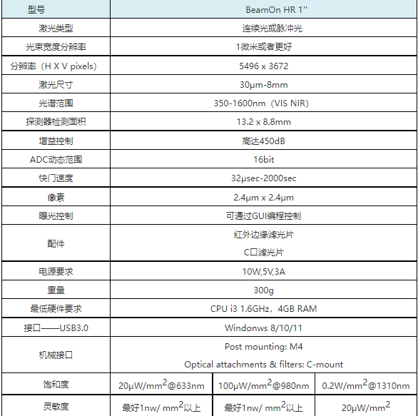 BeamOn HR 1''光斑分析仪规格参数:BeamOn HR 1''光束分析仪产品特点: