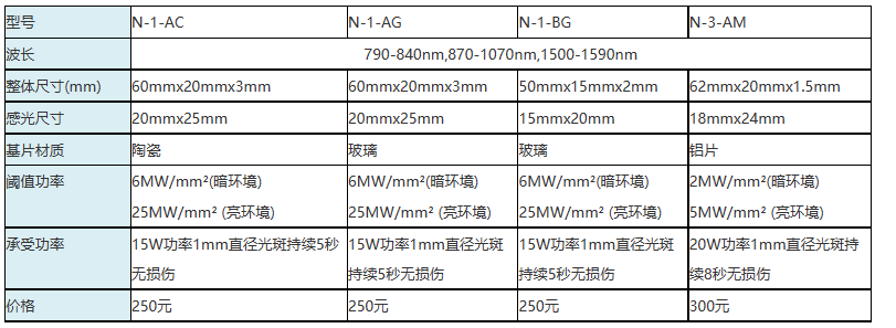 超高亮型红外激光探测卡(板)可将多个波段不可见近红外波段光束转换成可见光,因而可实现对红外光束的探测、跟踪、校对、识别。多波段探测卡可用于各类半导体激光器的近红外光探测、红外发光二极管发射光跟踪、YAG等大型激光器光束校对、光纤通信信号检测等领域。红外激光探测卡显示亮度高,成像清晰,可以替代scintacor的VIR-NIR1600或THORLABS的VRC4等进口产品。