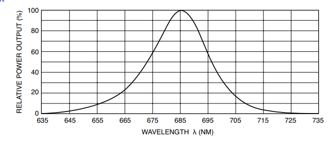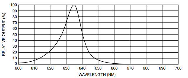 OD-624L可见光高功率发光二极管在IF=350mA测试条件下,总功率输出*小值是80mW,典型值是170mW;峰值发射波长典型值为635nm;光谱带宽为50%即22nm;半强度光束角典型值为7度,正向电压典型值是2.3V,*大值是3.0V。在IR=5uA测试条件下,反向击穿电压*小值是10V。