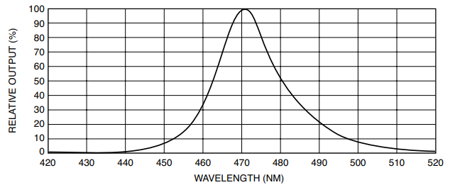 OD-469L可见光高功率发光二极管在IF=350mA测试条件下,总功率输出*小值是80mW,典型值是170mW;主发射波长*小波长为465nm,中心波长是470nm,*大波长是475nm;光谱带宽为50%即22nm;半强度光束角典型值为7度,正向电压典型值是3.2V,*大值是3.8V。在IR=2uA测试条件下,反向击穿电压*小值是5V。