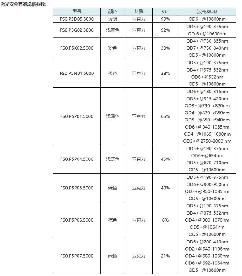 Laservision公司专注于激光防护方面几十年,提供各种激光防护的产品,如激光防护眼镜,激光防护窗,激光防护面罩等。其中激光防护眼镜型号众多,防护性能好,防护范围宽,价格便宜以及方便携带,是很多客户的理想选择。另外,为了能够全面保护面部,Laservision提供了激光防护面罩(Laser Safety Face Shields)。