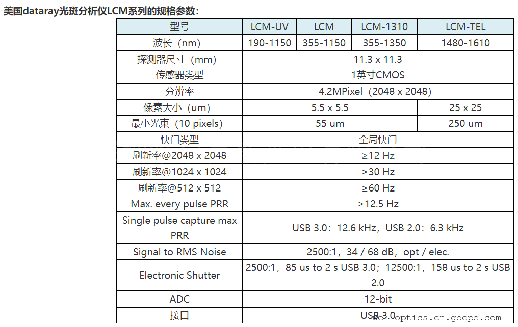 WinCamD-LCM光束分析仪是美国Dataray推出的高性价比的通用系列光斑分析仪,它具有广泛的波长范围:190-1610 nm,55 um-11 mm的大范围光束直径以及4.2MPixel的高分辨率的特点。除此之外,LCM系列光斑分析仪还具有电子触发全局快门和高达60+Hz的更新速率的优异特点。