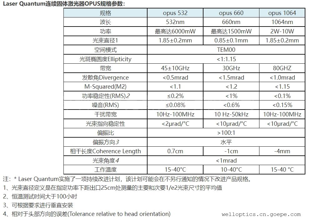 超紧凑连续激光器OPUS是一款高度通用的DPSS连续激光器,有三个波长,分别是532nm、660nm和1064nm,因此对应三个型号:opus 532,opus 660,opus 1064,其中,OPUS激光器具备坚固的专利设计,防止误报,寿命长和远程服务功能等特点。其独特之处在于集大功率、超强稳定性和紧凑尺寸于一身。OPUS系列激光器的专利设计具有卓越的性能,可抑制振幅噪声并提供高度稳定的输出能力,使得超紧凑高功率连续激光器能够在半导体检测和粒子计数应用中防止误报,并在精度要求极高的情况下提供可靠、可重复的响应。紧凑连续激光器OPUS有三个波长,分别是532nm、660nm和1064nm,因此对应三个型号:opus 532,opus 660,opus 1064,其中,OPUS激光器具备坚固的专利设计,防止误报,寿命长和远程服务功能等特点。Laser Quantum连续固体激光器OPUS的设计仔细考虑到了OEM集成商的需求,OPUS激光器的外形小巧,插座效率高(High wall plug efficiency),在热管理方面具有明显优势,使OPUS系列激光器能够在不允许或不可行水冷的环境中使用。其中,坚固耐用的光学机械设计使得系统的使用寿命延长,使超紧凑固体连续波激光器真正成为高可靠性、全天候系统(24/7 system)集成应用的首选激光器。超紧凑连续固体激光器主要应用在科研、显微镜以及生物成像等应用,因此还可叫做Laser Quantum科研激光器。