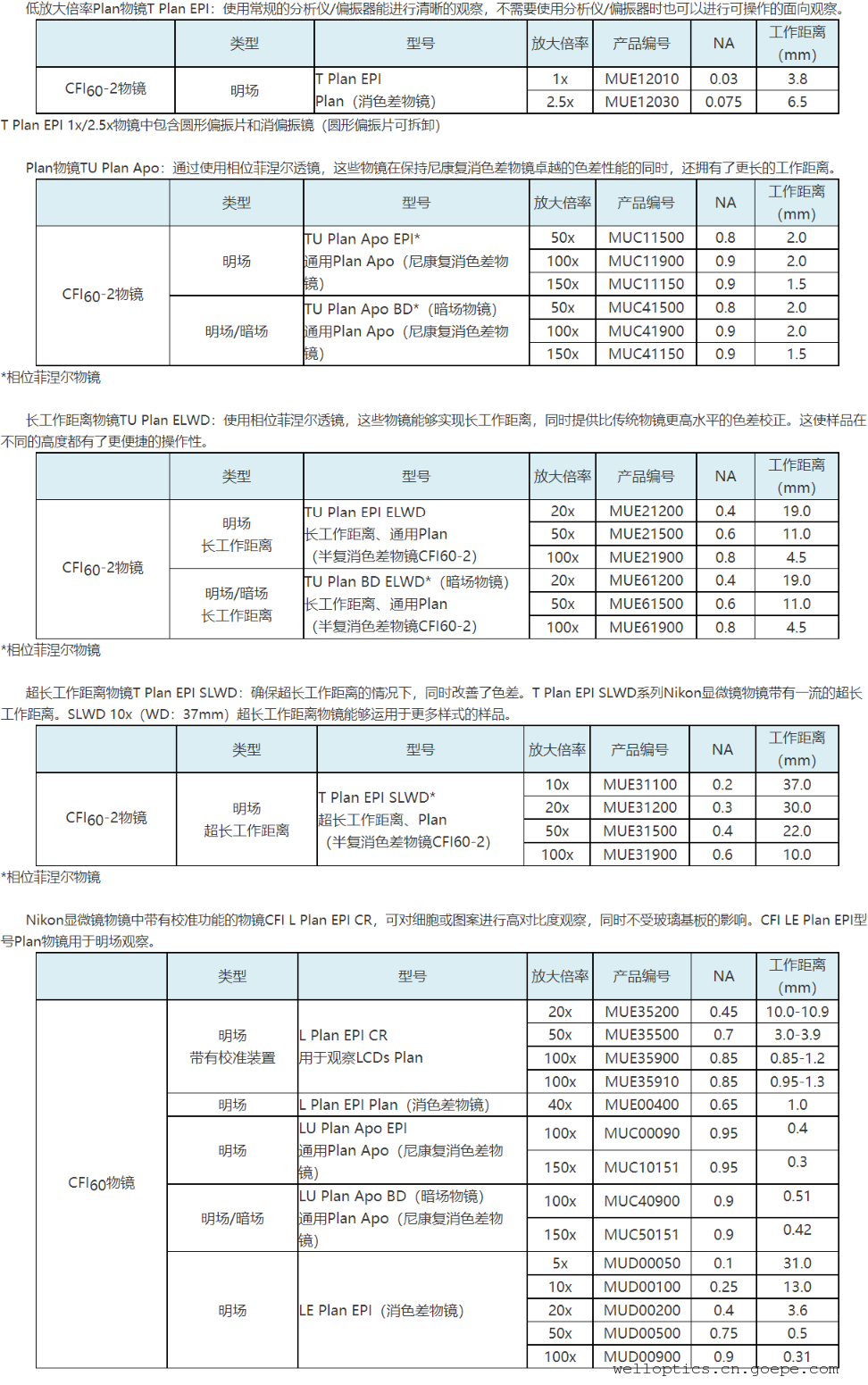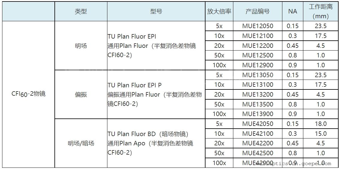 CFI60-2光学系统主要包含:标准平场物镜、长工作距离物镜、超长工作距离物镜、其它尼康物镜(Nikon物镜)。