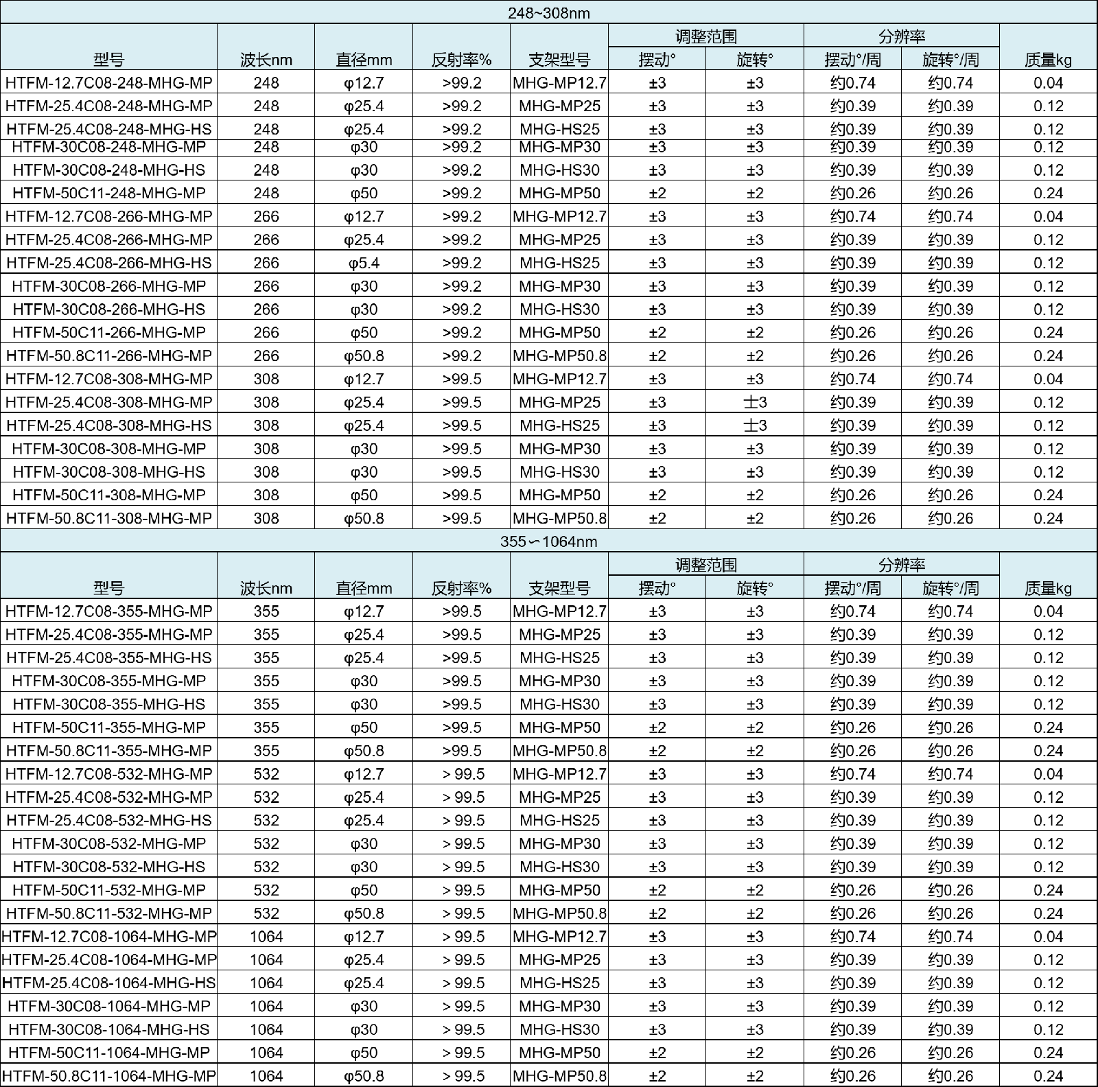 - 反射镜支架有高稳定型(MHG-HS)和量产型(MHG-MP)两种类型。