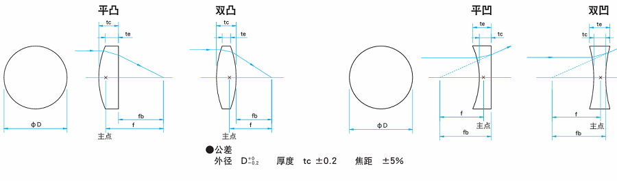 OptoSigma微小透镜是单透镜,焦距随波长变化。各波长的焦距请参考网页上的“焦距随波长变化特性数据”确认。平凸OptoSigma微小透镜的入射光线有方向性。请务必从凸面一侧射入平行光。否则球差会变差,焦点光斑会变大。由于OptoSigma微小透镜未镀有防反射膜,透镜的正面和反面都存在反射损失,所以透过率为90%左右。