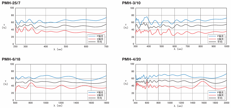 - 由于P,S偏光特性相差不大,用于激光光源或直线偏光的光源时,也可以正常地光量分束。(注意参照)