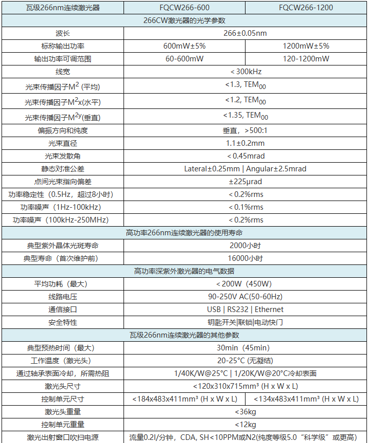 瓦级266nm连续激光器FQCW266-600和FQCW266-1200的特点: