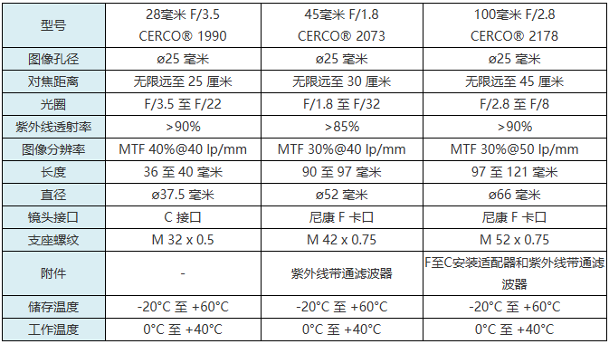 紫外镜头CERCO系列作为特种光学器件,其镜筒采用耐高温材料制造,可在-20℃至60℃环境稳定工作,CERCO紫外镜头适配像增强相机和sCMOS传感器、复消色差镜头。