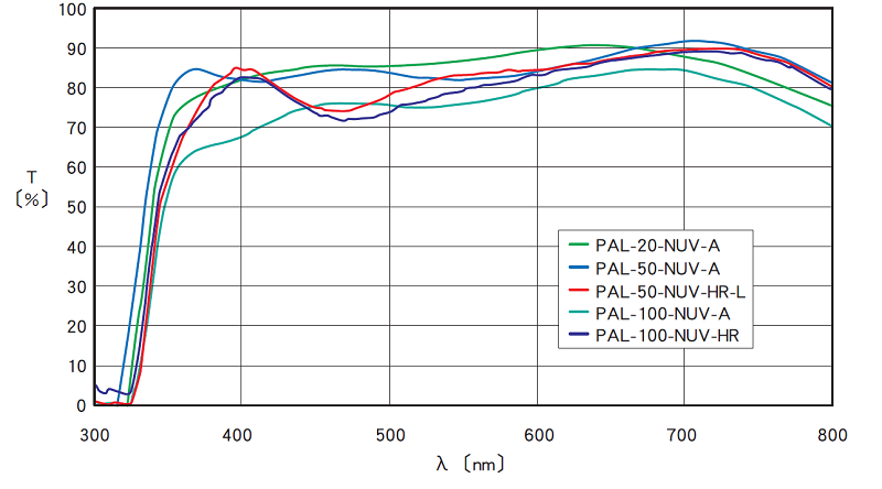 Optosigma近紫外物镜PAL-NUV透过率波长特性图(T:透过率)