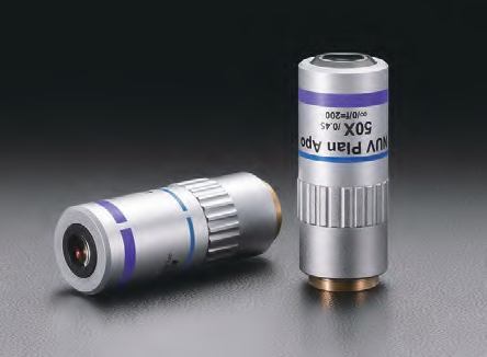 YAG激光的3次谐波(355nm)加工用的高NA无限共轭近紫外用物镜物镜。由于设计上校正了可见谱区像差,可以与激光光束同轴观察加工面。NUV物镜工作距离(WD)长,场曲也得到校正,在视场边缘也可以得到自然清晰的观察图像。可以用于同轴观察系统或激光导入光学系统等,是无限远校正的物镜。也可用于近紫外光及红外光的观察。近紫外用物镜也可用于可见光(532nm)的脉冲激光。激光损伤阈值(参考值) 0.05J/cm2 (355nm),0.1J/cm2 (532nm)(脉冲宽:10ns,重复频率:20Hz)
